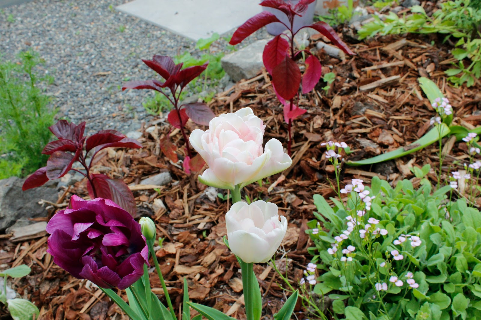 Dogwood and Creeping Jenny behind more tulips.